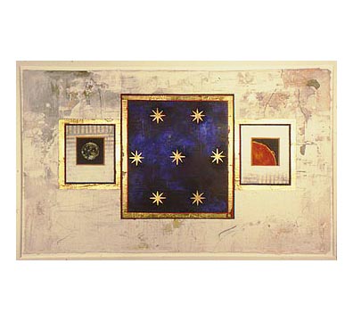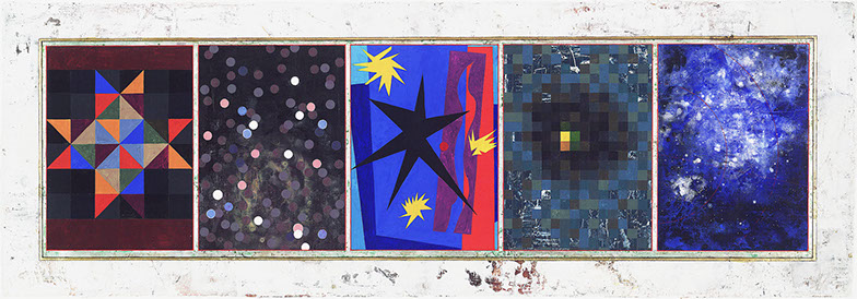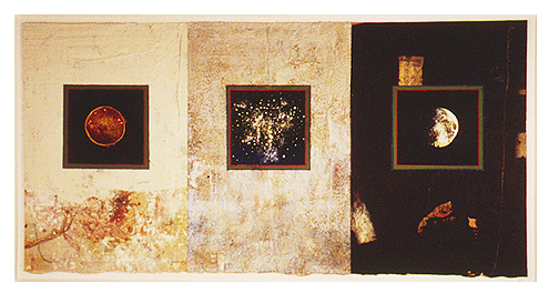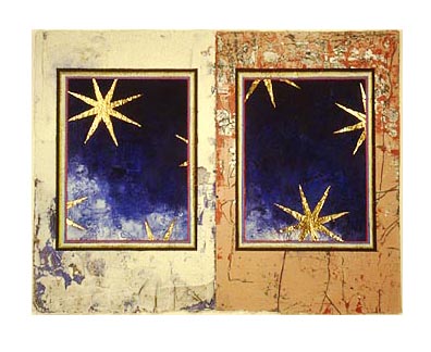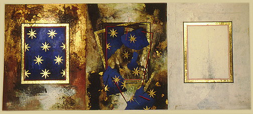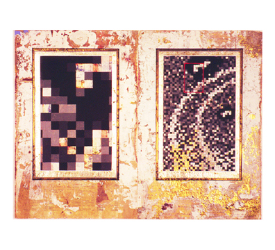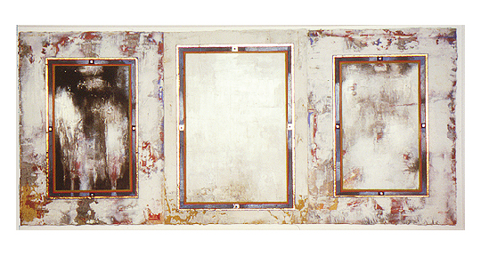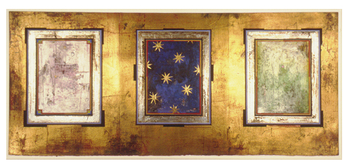 gouache, acrylic mediums, bronze leaf, plaster, burnish clay, charcoal,